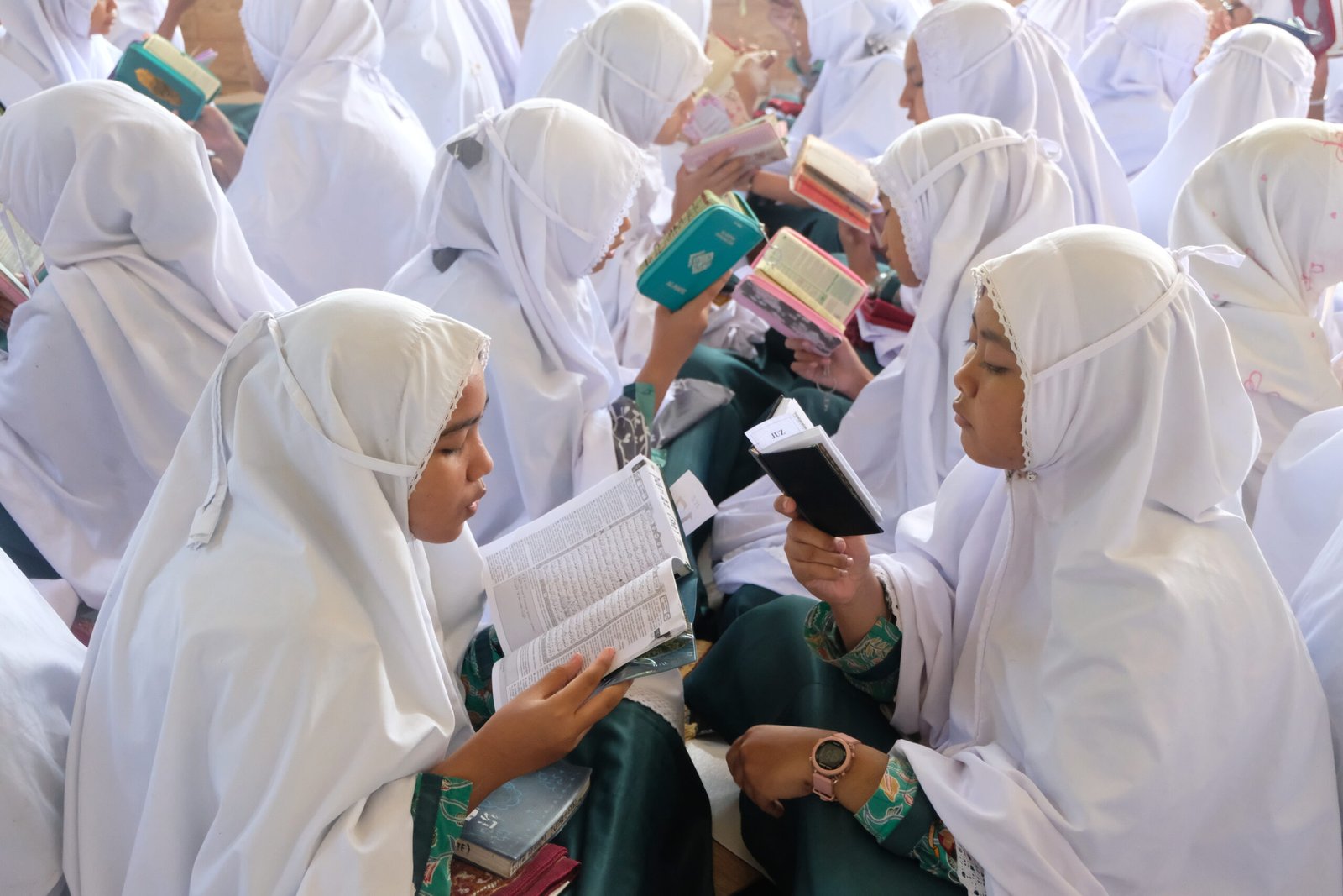 Acara kemudian dilanjutkan dengan doa Khotmil Qur’an yang dipanjatkan bersama-sama, memohon keberkahan ilmu, kemudahan dalam menuntut ilmu. Doa dipimpin oleh salah satu ustadz dengan penuh kekhusyukan, diiringi harapan agar Al-Qur’an senantiasa menjadi pedoman hidup para santri.