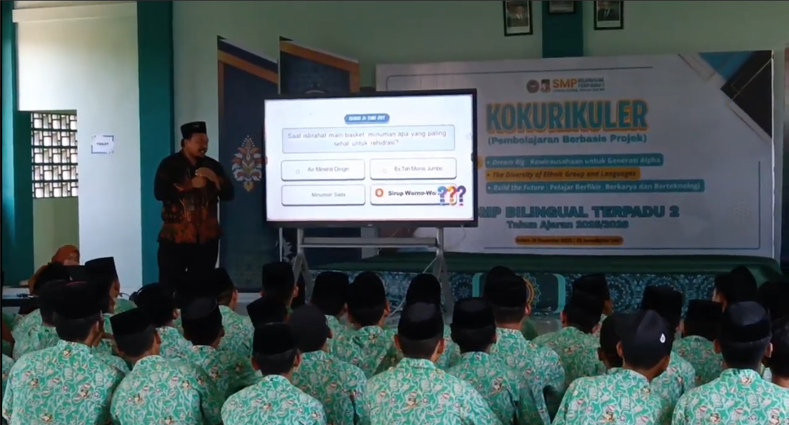 Materi gizi disampaikan kepada santri kelas IX SMP Bilingual Terpadu 2 oleh Ustaz Wahyu Margo Utomo pada Rabu, 17 Desember 2025. Kegiatan ini bertujuan memberikan pemahaman tentang pentingnya kandungan gizi dalam setiap bahan pangan yang dikonsumsi maupun diolah. Santri dikenalkan pada konsep gizi seimbang serta peran protein nabati sebagai sumber nutrisi alternatif. Penyampaian materi dilakukan secara komunikatif agar santri mampu mengaitkan teori dengan praktik projek tempe nonkedelai.